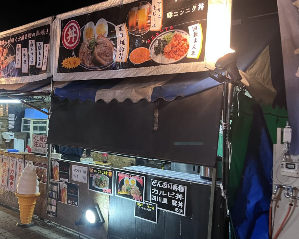 串焼き屋台に併設した丼屋台。