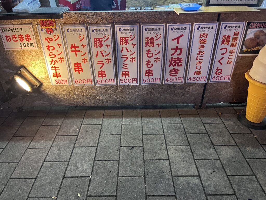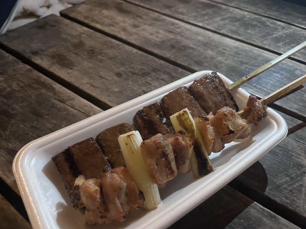 ラーメン屋台のお隣、定番の牛串やちょっと珍しい豚ハラミなど、注文してからその場で焼く炭火の香りが香ばしい人気屋台。